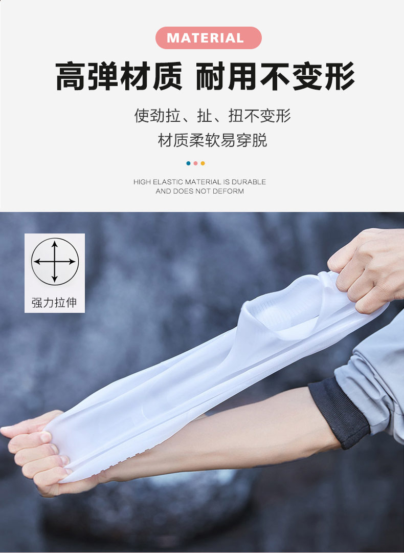 這款硅膠防水鞋套使用的時(shí)候就比較方便了,在需要使用的的時(shí)候把鞋套進(jìn)去就可以了,小巧方便,不占地方又不影響美觀,方便省時(shí),重要的是,即使是大雨磅礴的天氣,你的鞋子依舊可以完好無損。它使用的是食品級(jí)硅膠原材料制作的,環(huán)保安全,無異味,不會(huì)讓你聞到任何廉價(jià)塑料的味道。